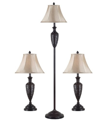80008BRZ Includes Set of 3 Lamps This elegant line of lighting doesn't dissapoint, especially with the Lorrie floor and table lamp set of three. The two table lamps and one floor lamp are finished with a beautiful bronze body covered by their subtle gold fabric shades. A no fail way to add the finishing touches to a room are with these classic, stylish lamps. Features: -One light floor lamp and two one light table lamps -Multi-pack collection -Bronze finish -Gold fabric shades -Both table lamps and floor lamp have 3-way switch -Table lamps and floor lamp each accomodate 1-100 watt 3-way bulb -Floor lamp dimensions: 61'' H x 15'' W x 15'' D -Table lamp dimensions: 28'' H x 14'' W x 14'' D